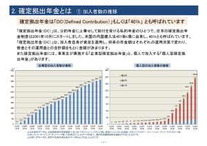 確定拠出年金は「DC(Defined Contribution)」もしくは「401k」とも呼ばれています 「確定拠出年金(DC)」は、公的年金に上乗せして給付を受ける私的年金のひとつで、日本の確定拠出年金制度 は2001年10月にスタートしました。米国の内国歳入法401条k項に由来し、401kとも呼ばれています。 「確定拠出年金(DC)」は、加入者自身が資産を運用し、将来の年金額はそれぞれの運用次第で変わり、掛金と その運用益との合計額をもとに金額が決まります。 また確定拠出年金には、事業主が実施する「企業型確定拠出年金」と、個人で加入する「個人型確定拠出年金」 (iDeCo)があります。