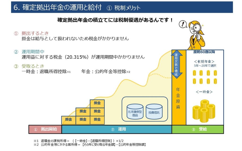 パンフレットの解説の十七回目は、「6. 確定拠出年金の運用と給付 ①税制メリット」の続きです。今回は受取時に年金受取りを選択した場合の税制優遇を説明します。