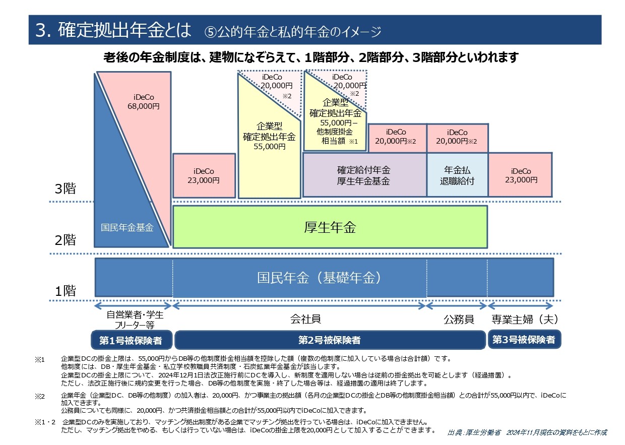 3階部分は、公務員の年金払退職給付、会社員の確定給付年金、企業型DC、個人で加入するiDeCoが該当します。