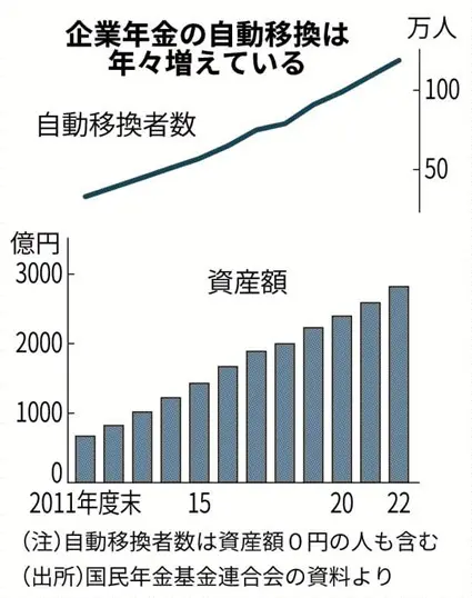 会社を離れた月の翌月から6カ月以内に手続きしなかった場合、資産は国民年金基金連合会に自動で移る。「自動移換」と呼ばれる仕組みで、資産は運用されずに塩漬けとなる。毎年624円の管理手数料が引かれる。」