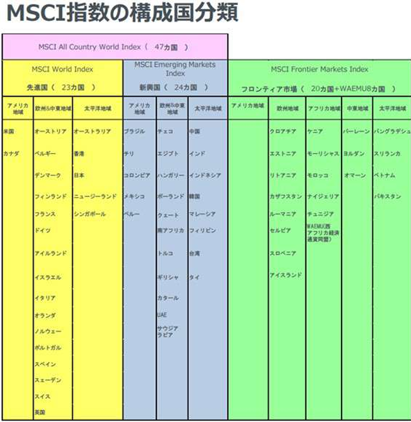MSCI指数ハンドブックには、MSCI構成国の分類が表示されています。一度、ご確認いただくと各種MSCIインデックスの理解が深まると思います。